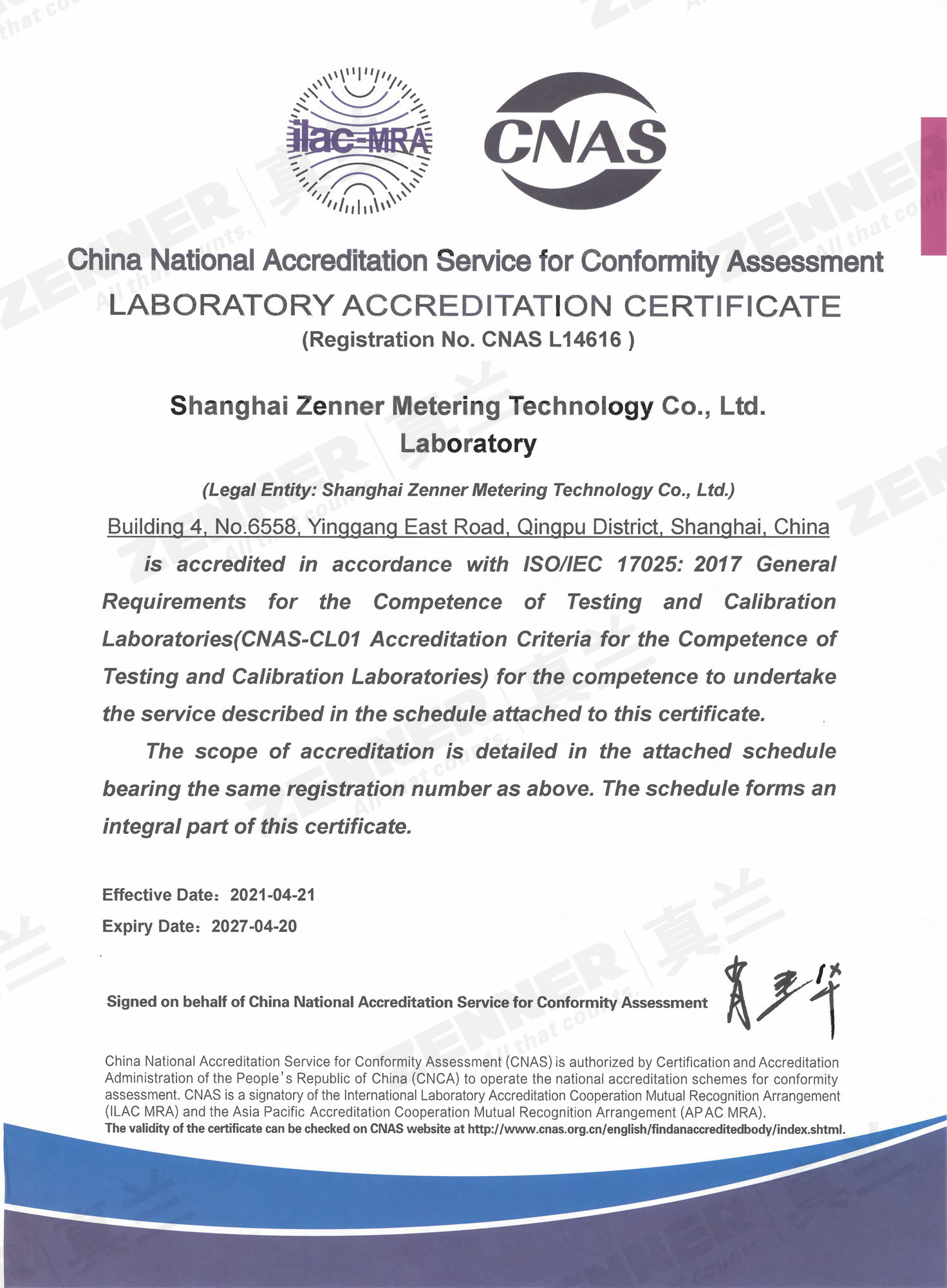 中国合格评定国家认可委员会(英文名称为:China National Accreditation Service for Conformity Assessment 英文缩写为:CNAS),是根据《中华人民共和国认证认可条例》的规定,由国家认证认可监督管理委员会(CNCA)批准设立并授权的国家认可机构。CNAS是国际实验室认可合作组织(ILAC)、亚太认可合作组织(APAC)的互认协议成员,通过认可的实验室出具的检测报告具有CNAS和ILAC的标识,所出具的数据具有国际权威性。