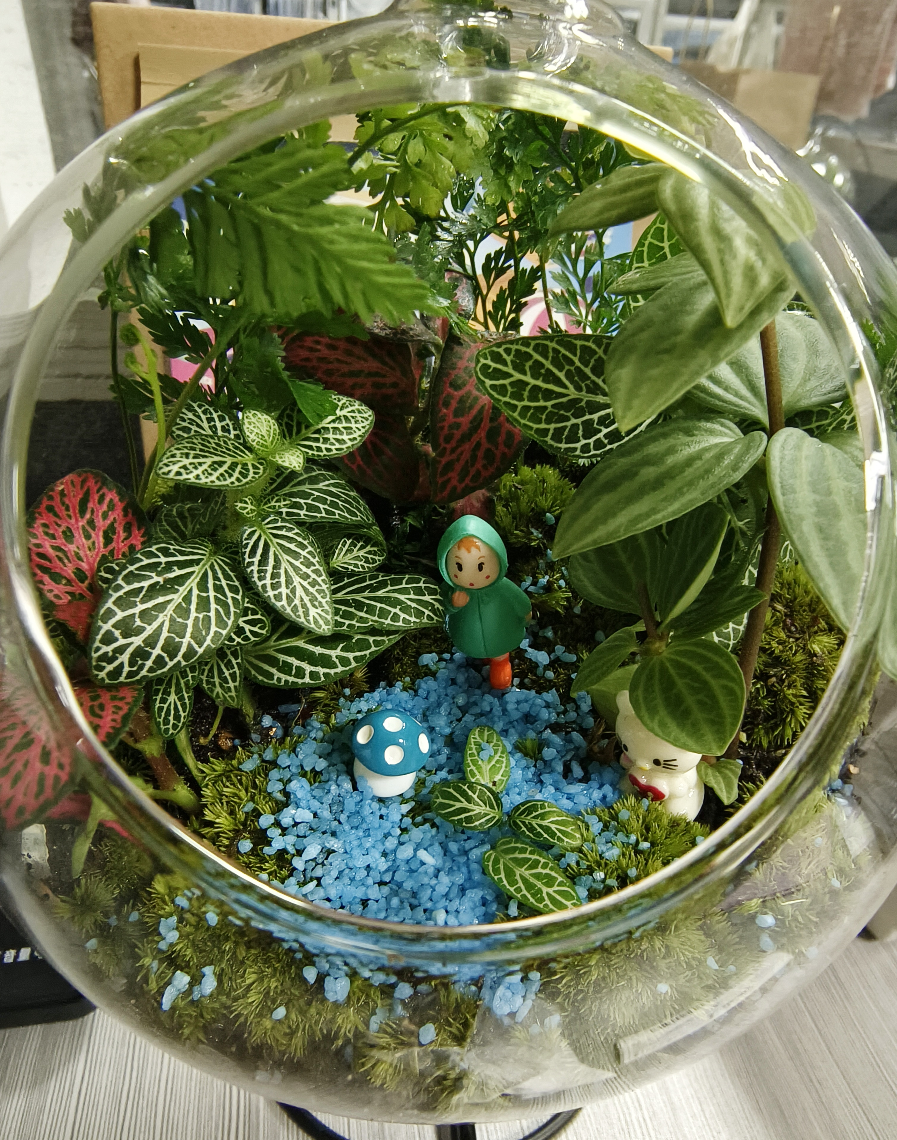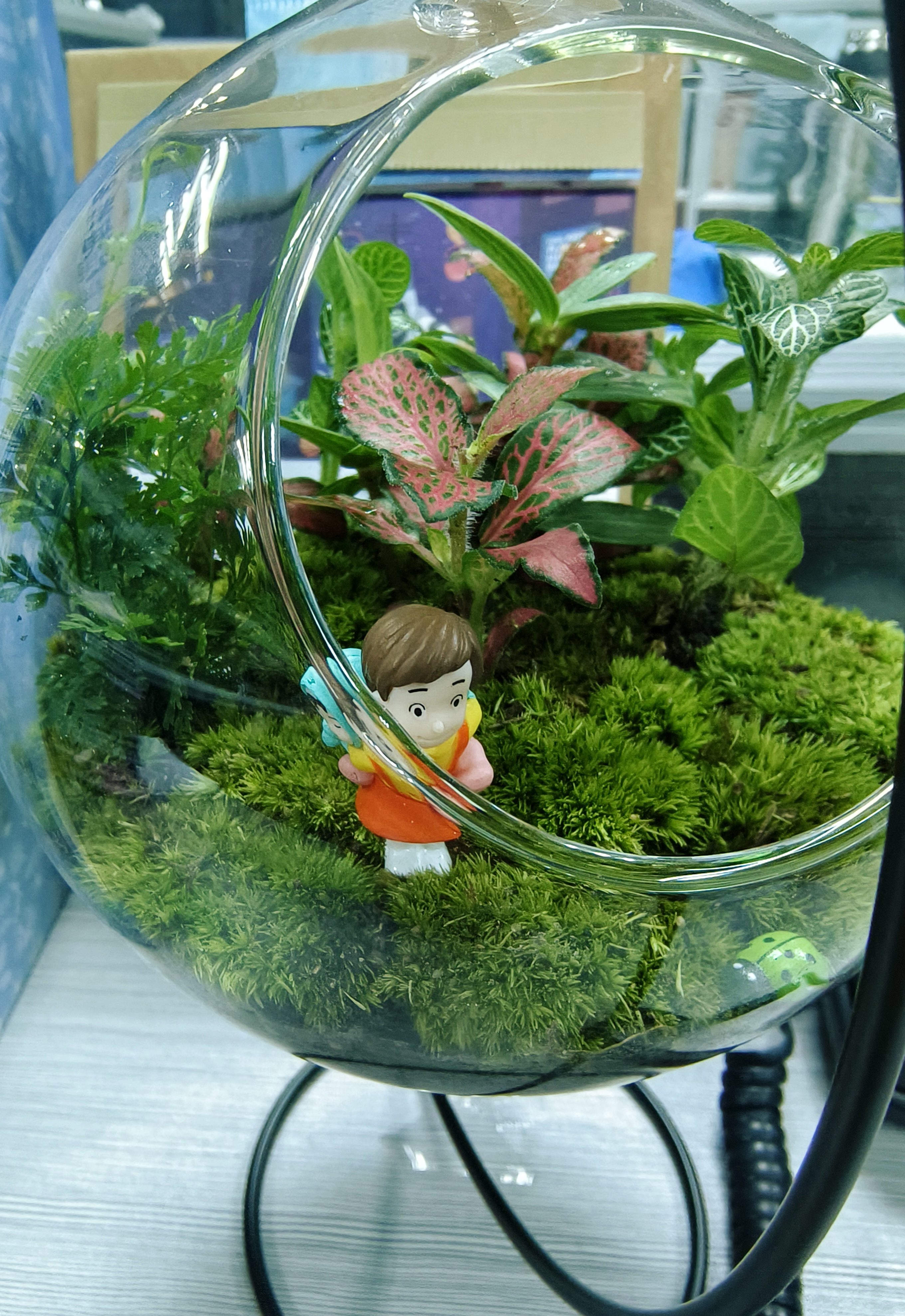 什么是微景观?微景观是盆景的缩小版本,采用蕨草、苔藓、网纹草等生长环境习性相近的微型植物,搭配各种砂石、卡通人物,共同组成一个完整的微生态系统。劳累疲乏时,瞥见那一抹绿,让人仿佛跌落到简单纯净的童话世界,变得轻松、惬意。